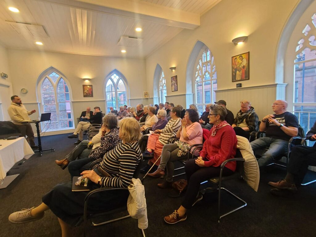 The hope that ran through the evening grew even stronger when Michael Malone of Christians4Palestine gave an update on a twinning initiative between the Latin Patriarchate of Jerusalem and the Diocese of Down and Connor. This partnership will see the West Belfast Family of Parishes twinning with parishes in the West Bank, providing concrete support that helps Palestinians remain in the land they call home. As Alareer wrote, “If I must die / let it bring hope / let it be a tale.”