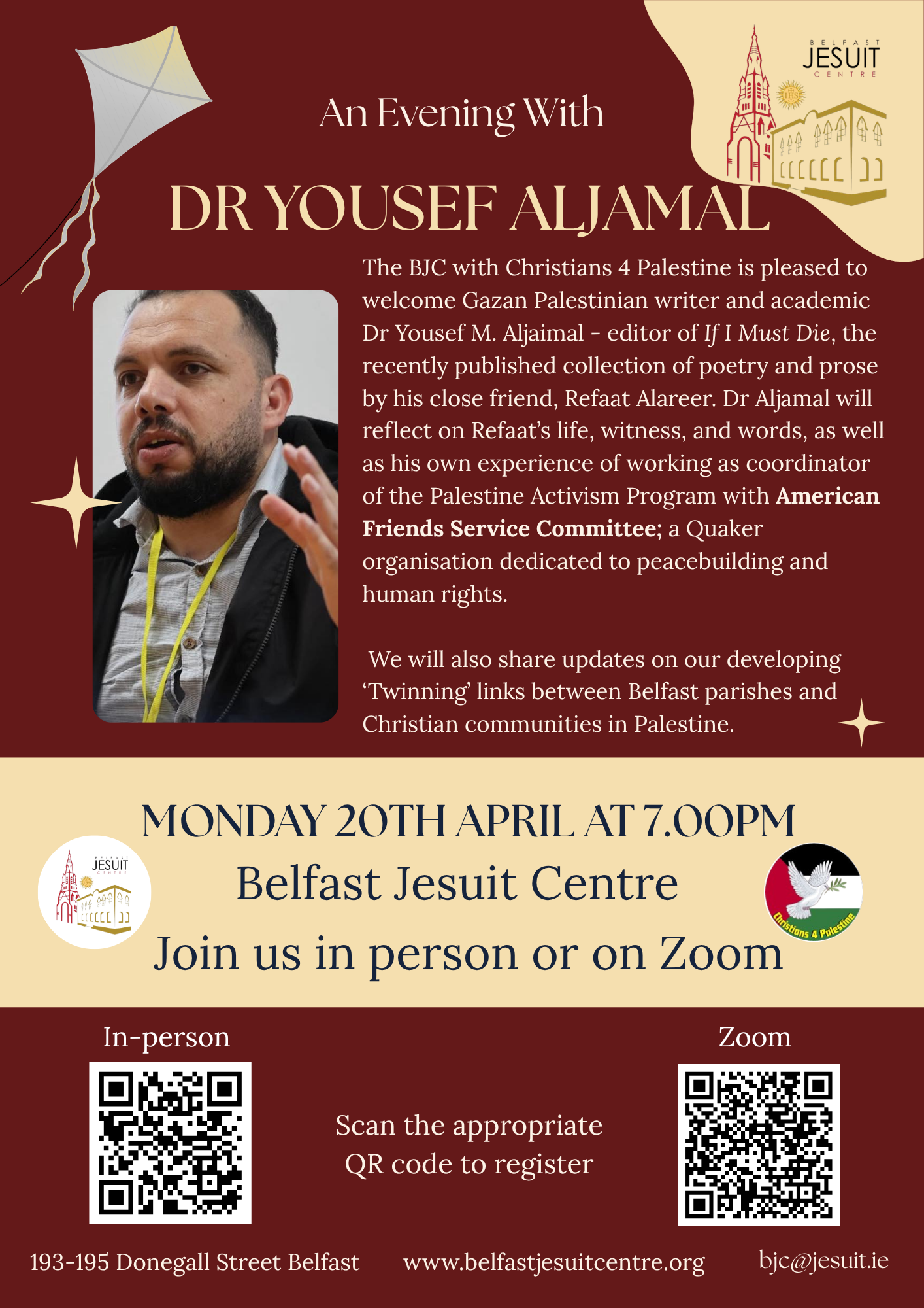 The Belfast Jesuit Centre, together with Christians 4 Palestine, is pleased to welcome Dr Yousef M. Aljamal, Gazan Palestinian writer and academic. Dr Aljamal is the editor of If I Must Die, the recently published collection of poetry and prose by his close friend, Refaat Alareer.