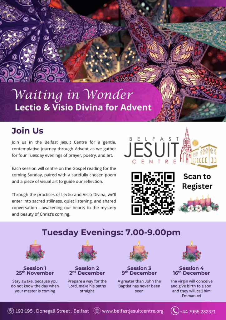 Join us in the Belfast Jesuit Centre for a gentle, contemplative journey through Advent. Over four Tuesday evenings, we’ll gather to reflect on the Gospel reading for the coming Sunday, accompanied by a carefully chosen poem and a piece of visual art.